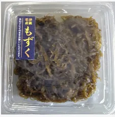 この味付もずくは、酢を一切使わず、めんつゆのような調味料を使い、まろやかな風味に仕上げています。酢が苦手な方、お子様やご年輩の方にも優しく召し上がれます。かつお風味の出汁やそれに生姜をいれた出汁で、もずくのつるつるとした味わいが楽しめて、とても美味しいです。