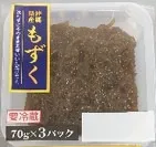 そこで、株式会社SEAMOBA1カップにもずくだけをたっぷり70g入れて、3連パックとする製品を企画いたしました。株式会社SEAMOBAの営業ではこの製品を愛称で「そのまんまもずく」と呼んでいます。